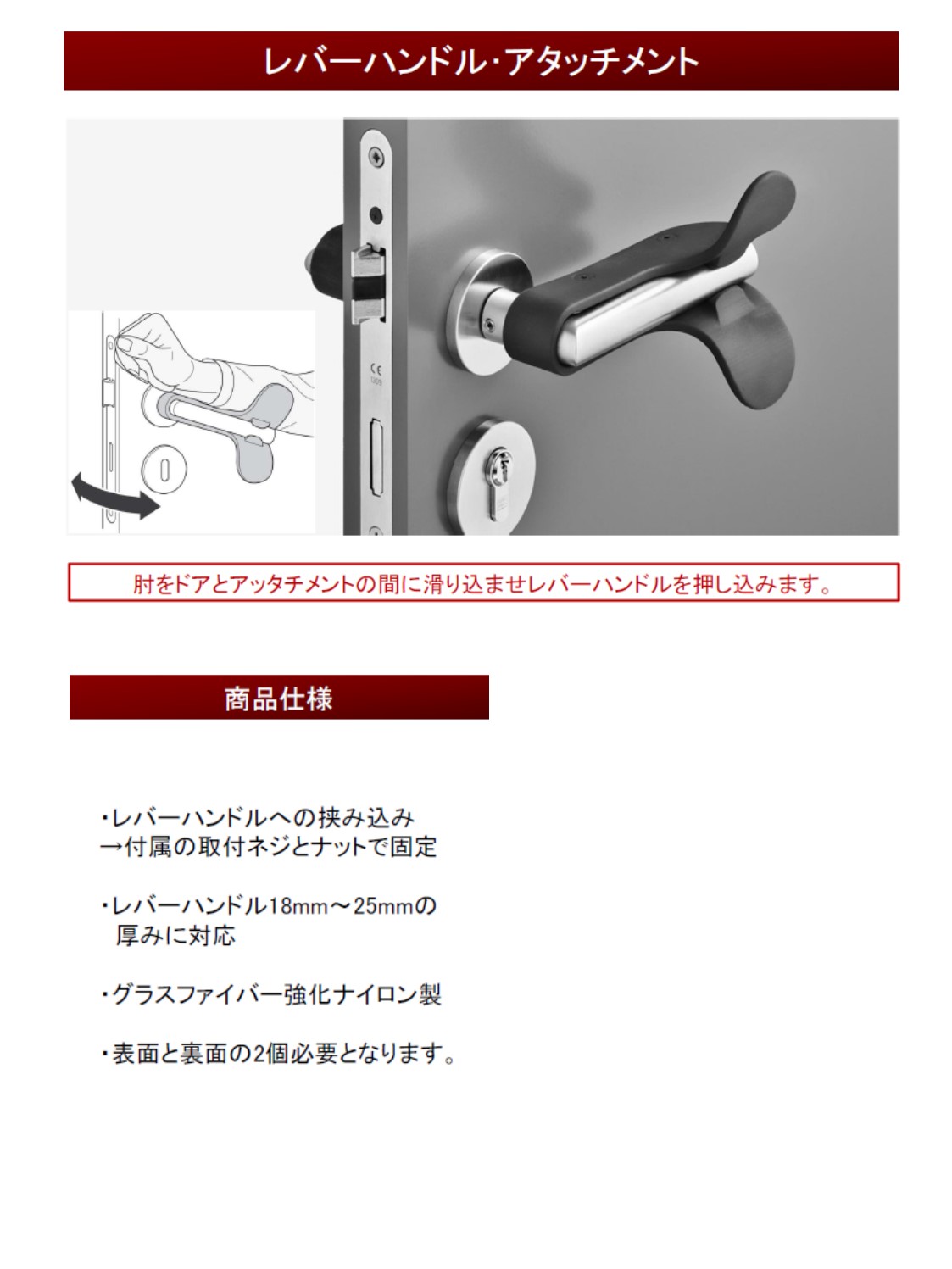 扉のレバーを挟み込んで使用します。肘で開ける発想は斬新です。